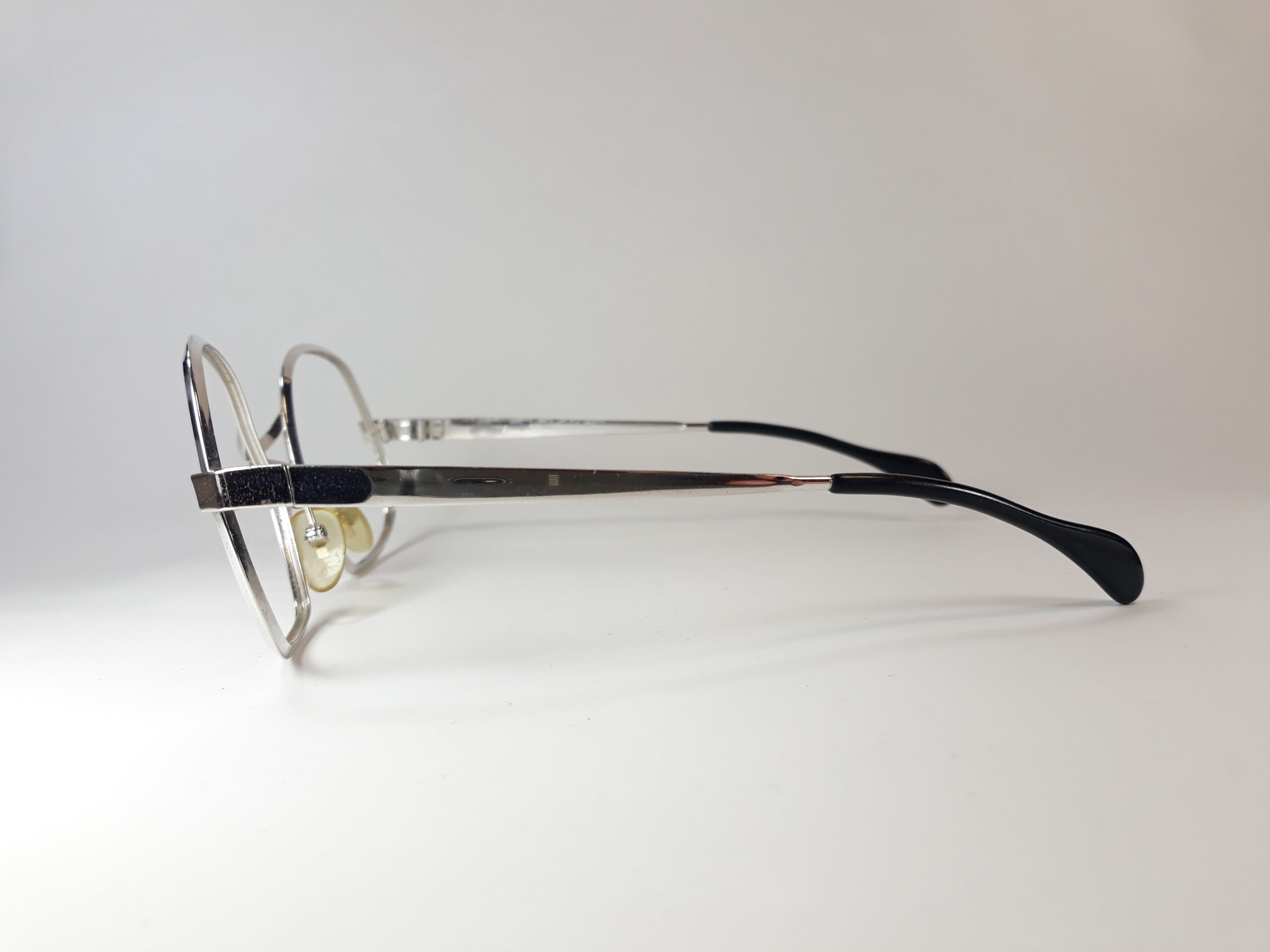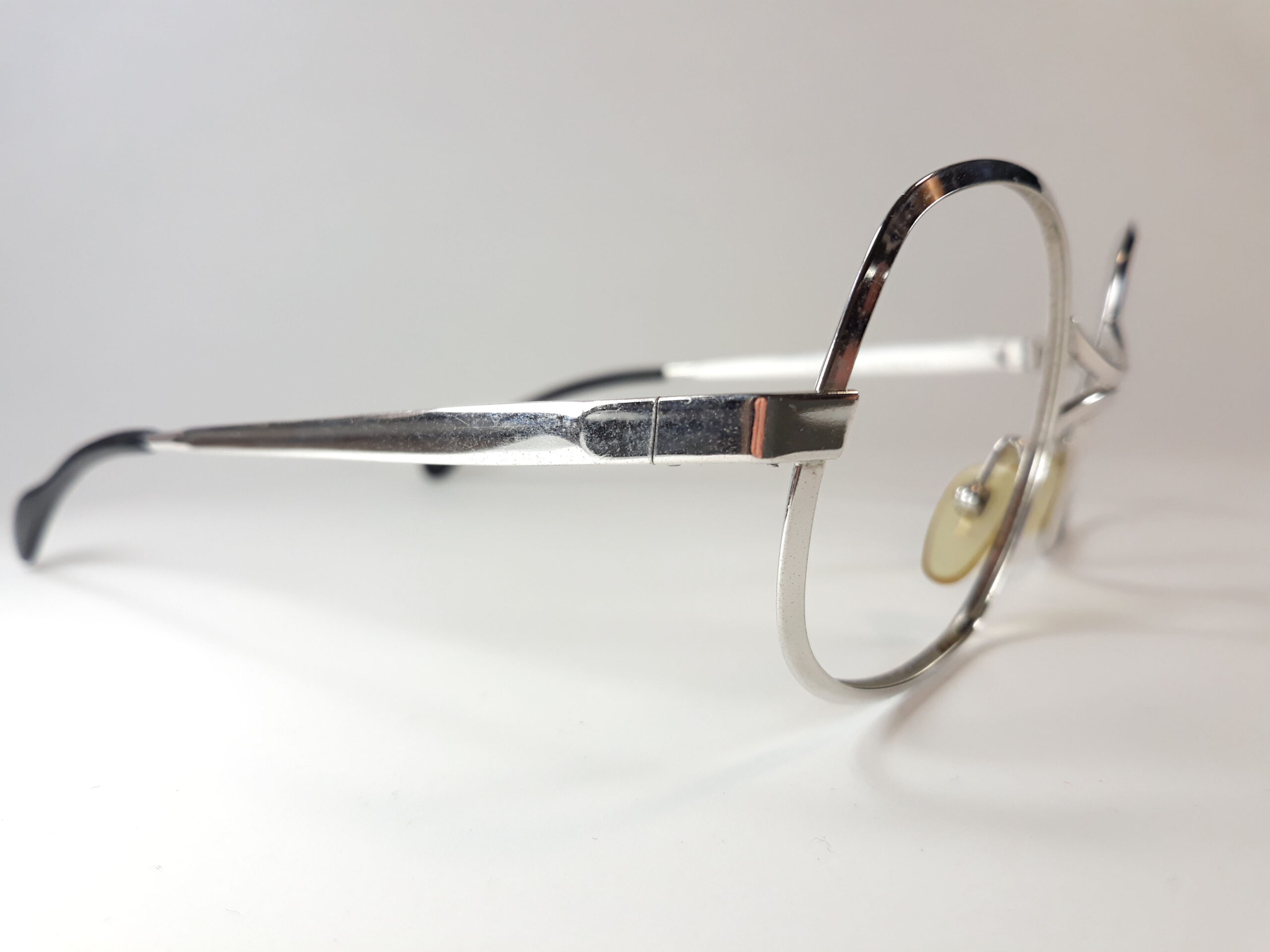 Der Rahmen der Brille ist aus Metall in silberner Farbe und mit Farboptik in glänzend.