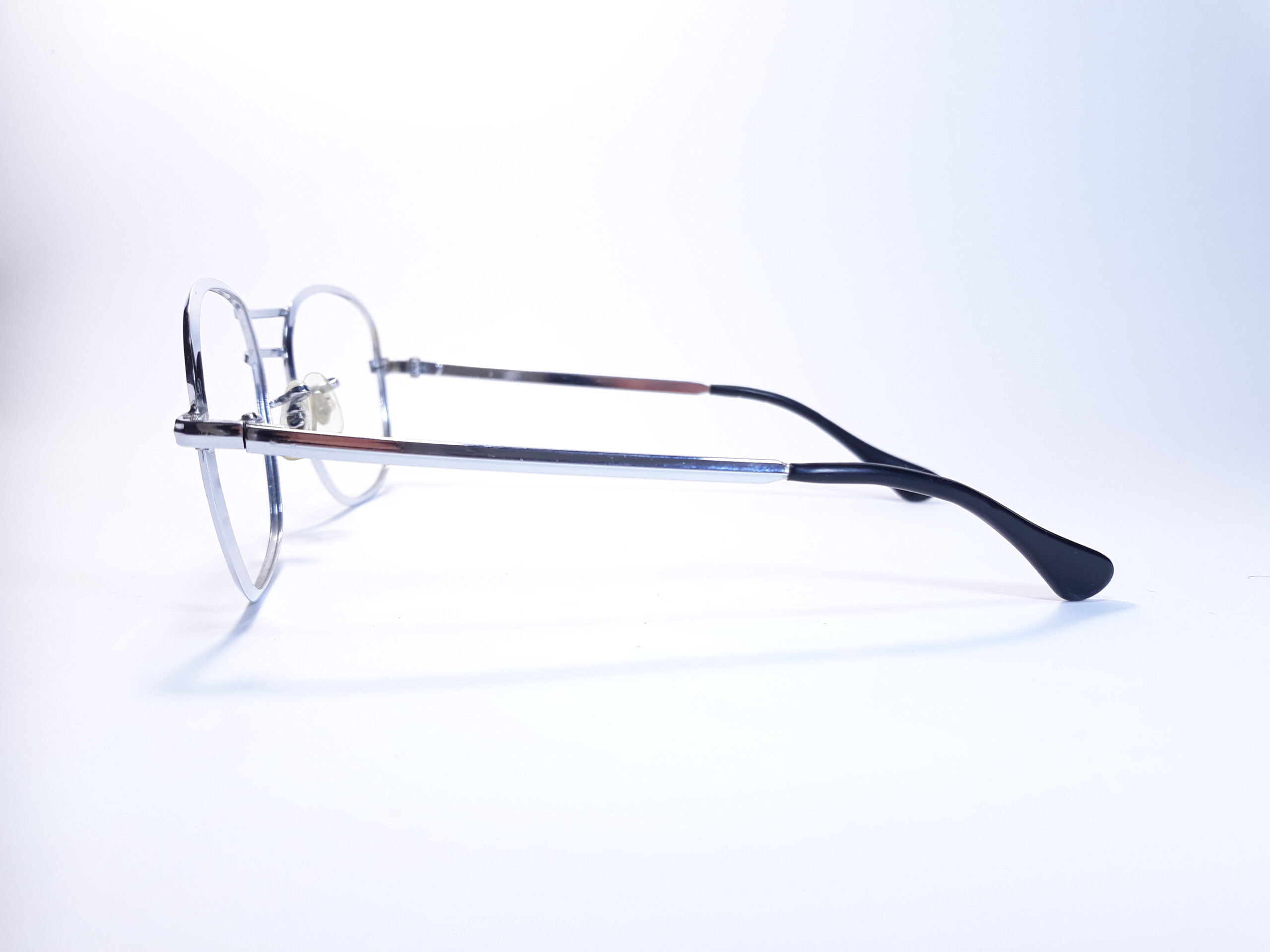 Der Rahmen der Brille ist aus Metall in silberner Farbe und mit Farboptik in glänzend.