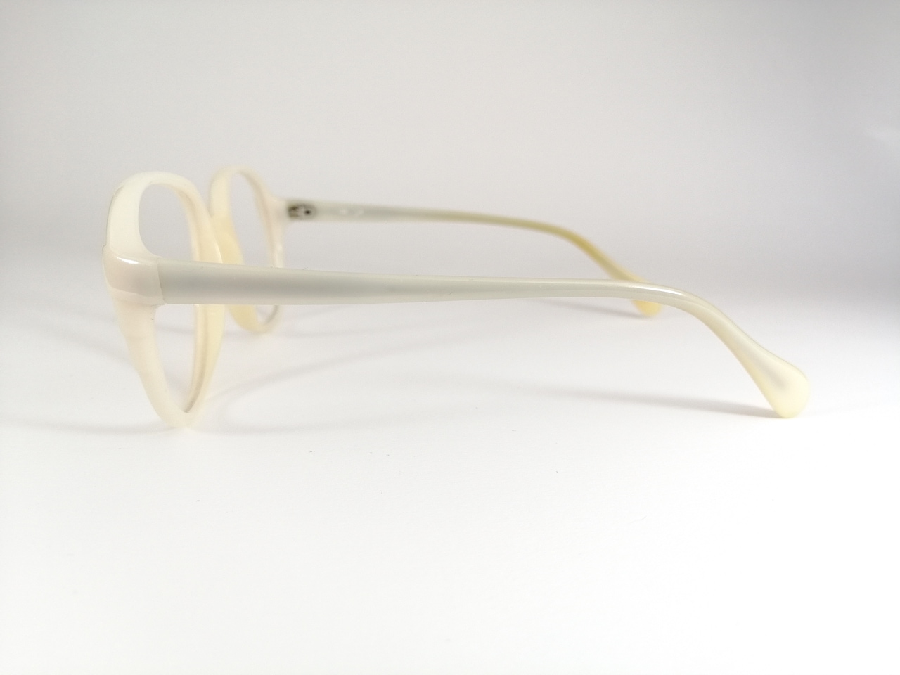 Der Rahmen der Brille ist aus Kunststoff in weißer/ beiger Farbe und mit Farboptik in glänzend.