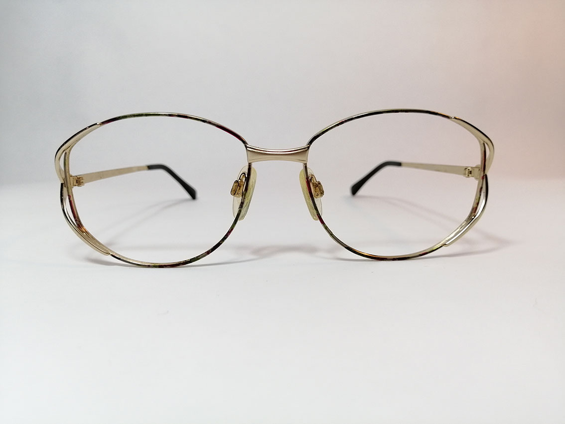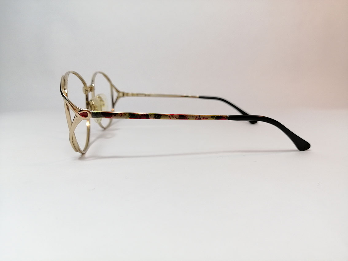Der Rahmen der Brille ist aus Metall in goldener/ roter und grüner Farbe mit Muster wie abgebildet und mit Farboptik in matt und glänzend.