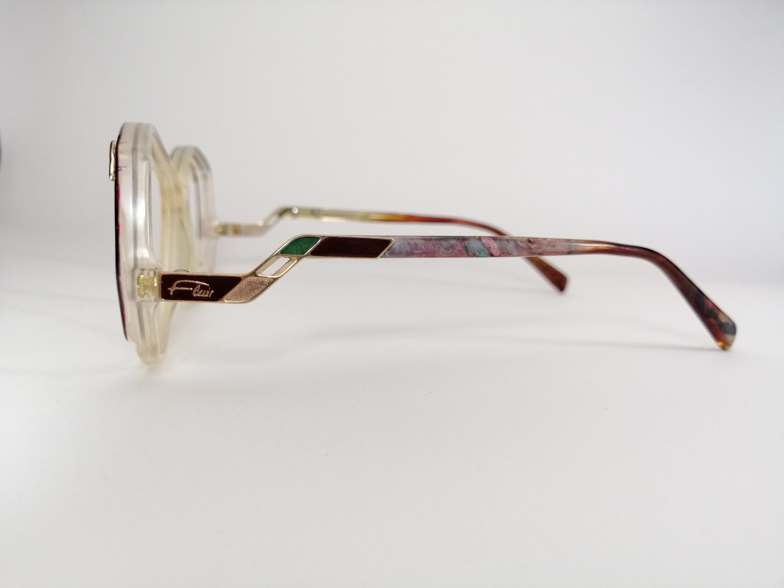 Marke FLAIR – Made in West-Germany. Die Bügel haben vorne eine Abstufung aus Metall. Der Rahmen ist an der oberen Häfte und an den Bügeln bunt gesprenkelt.