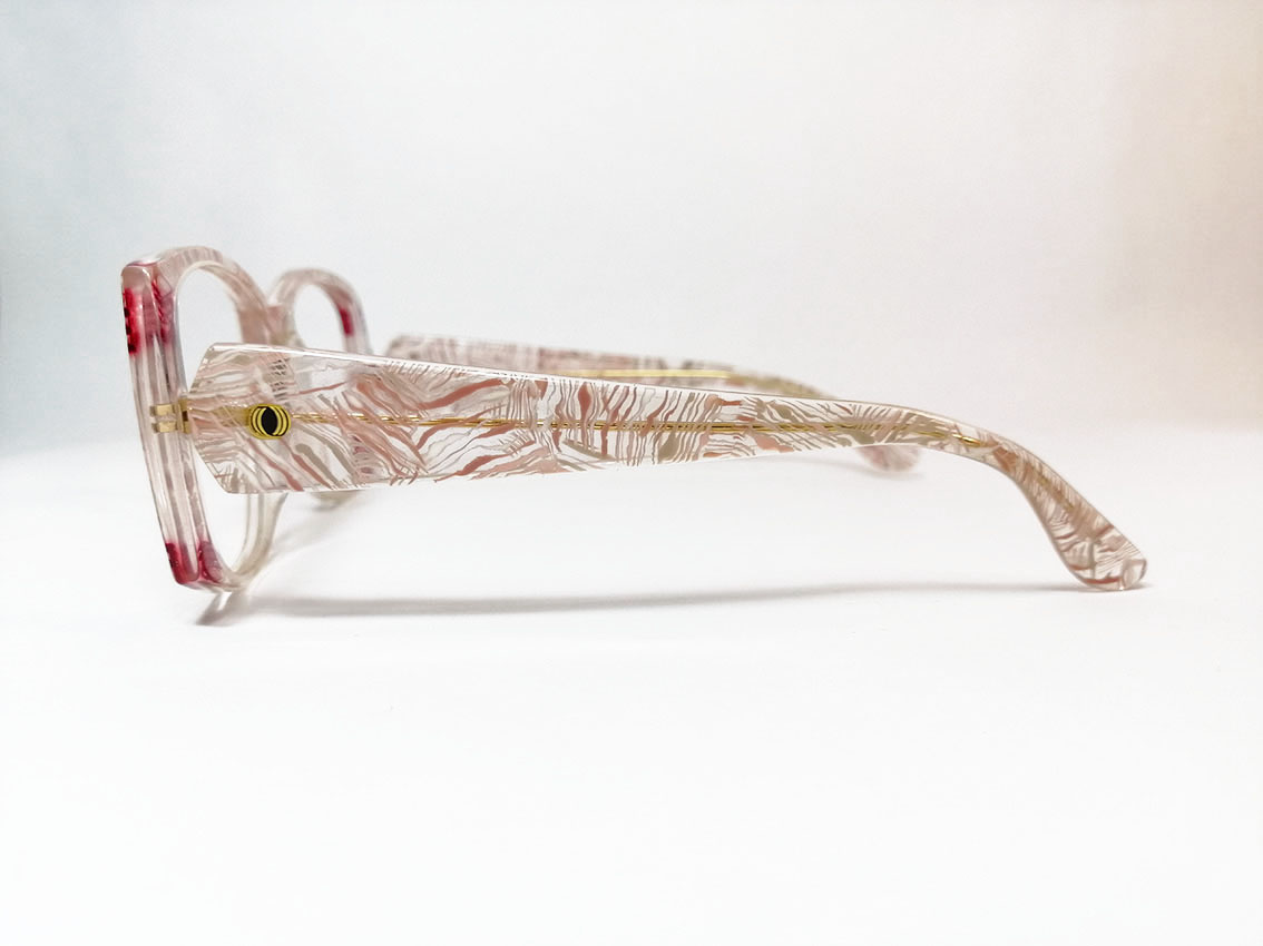 Der Rahmen der Brille ist aus Kunststoff in rosa/ grauer und roter Farbe mit Graffitimuster und mit Farboptik in glänzend und transparent.