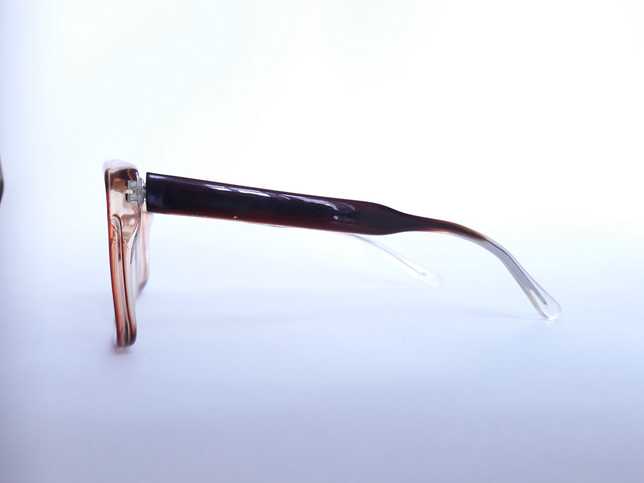 Der Rahmen der Brille ist aus Kunststoff in roter/ beiger Farbe mit verlaufendem Muster und mit Farboptik in glänzend und transparent.