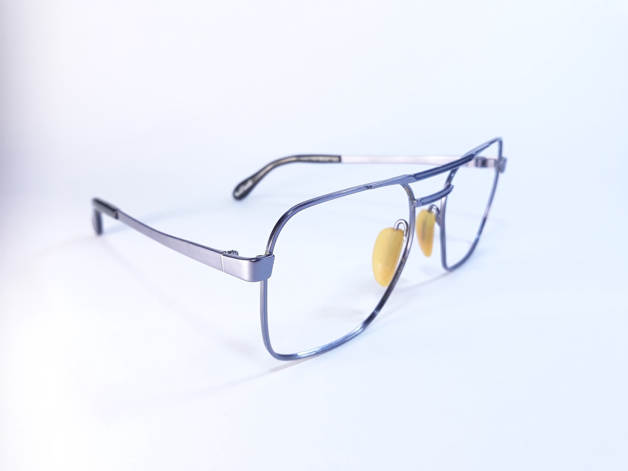 Der Rahmen der Brille ist aus Metall in grauer Farbe und mit Farboptik in matt.