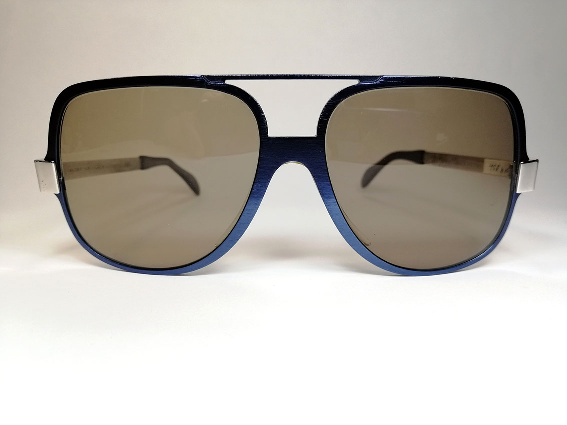 Der Rahmen der Brille ist aus Metall in blauer/ silberner Farbe und mit Farboptik in matt.