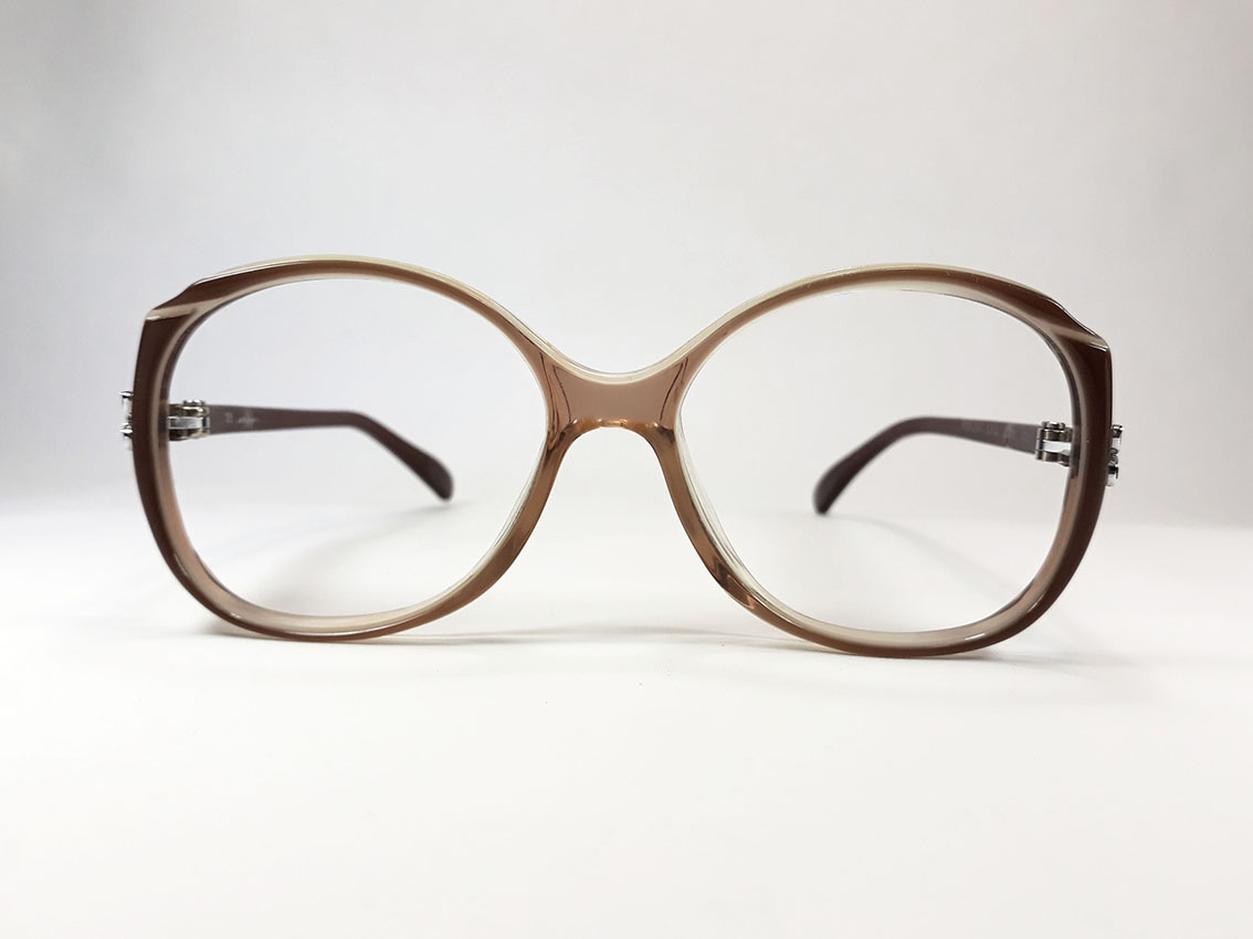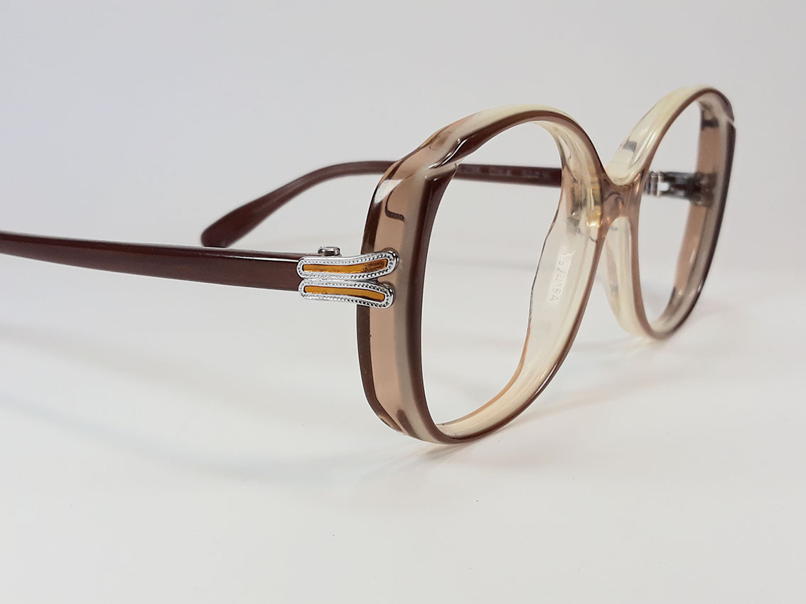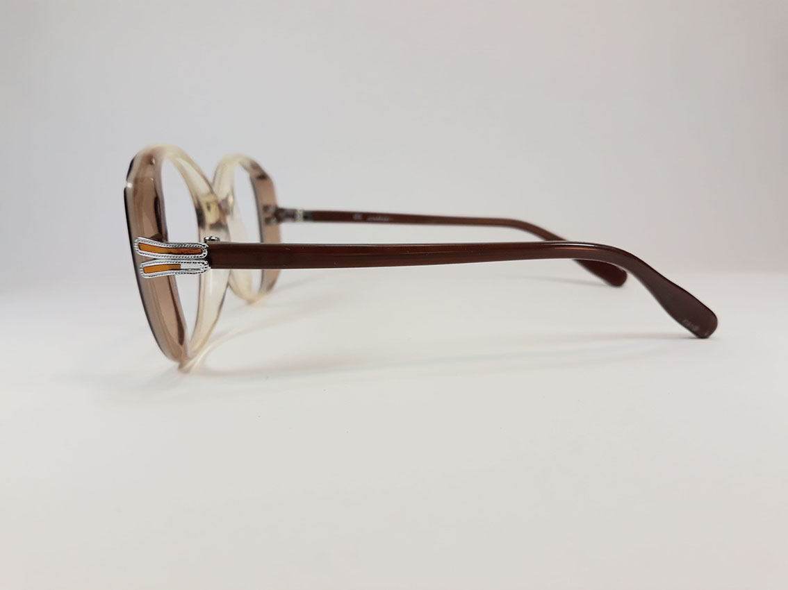 The frame of the glasses is made of plastic and metal in brown/ beiger and silver color with pattern as shown and with color look in glossy and transparent.
